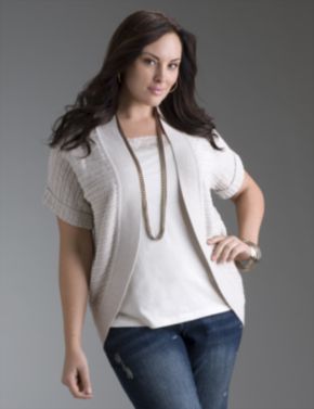 Cable knit cocoon shrug: Cable knit cocoon style shrug is a perfect layering piece over tanks, camis and dresses. Short sleeves are cuffed. Ribbed band goes from neckline, down open placket and across bottom. Selling price of this cable knit shrug is $49.50.You can save good amount of money on these plus-size women clothing by using Lane Bryant Coupon Code or online deals.